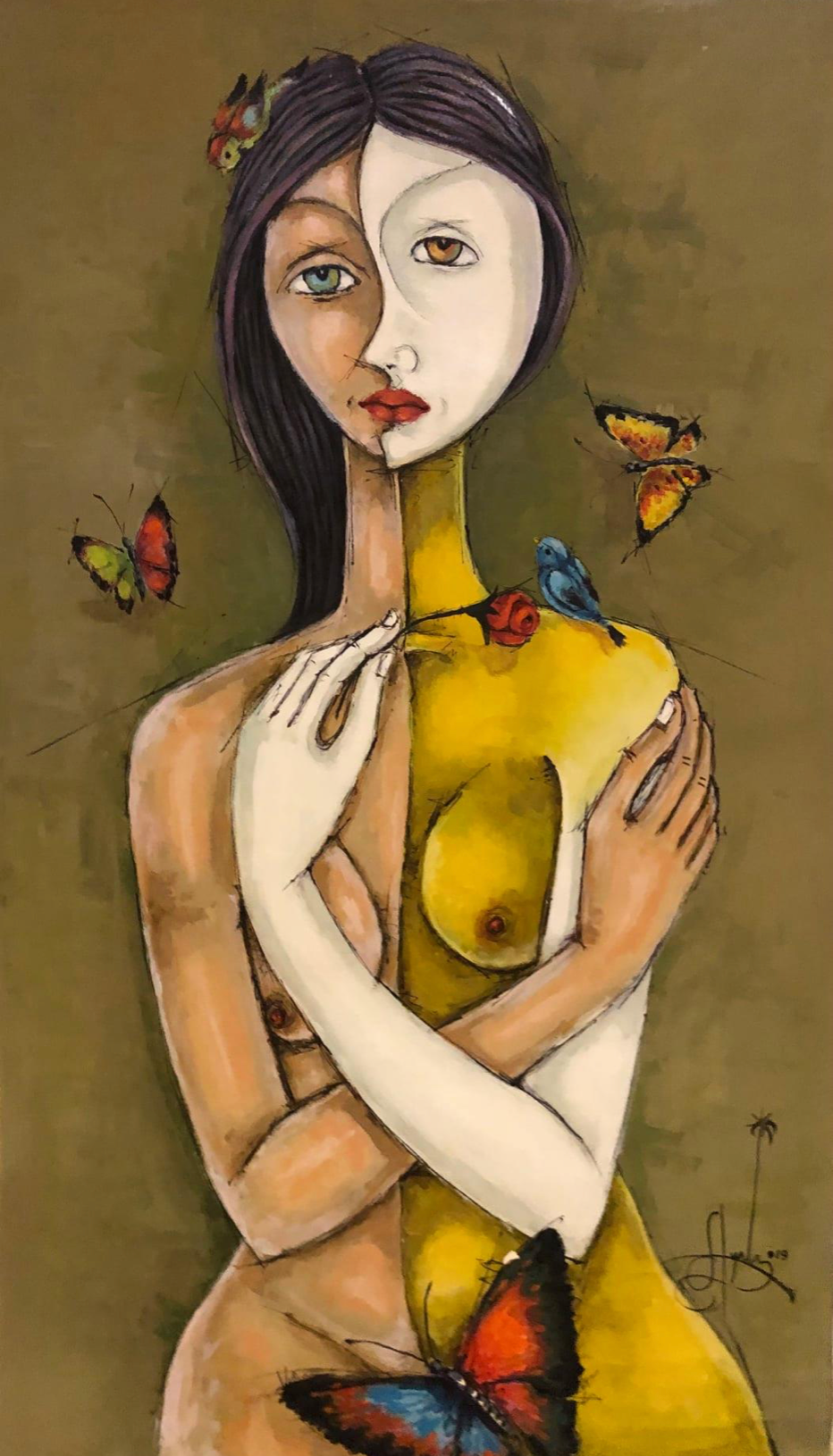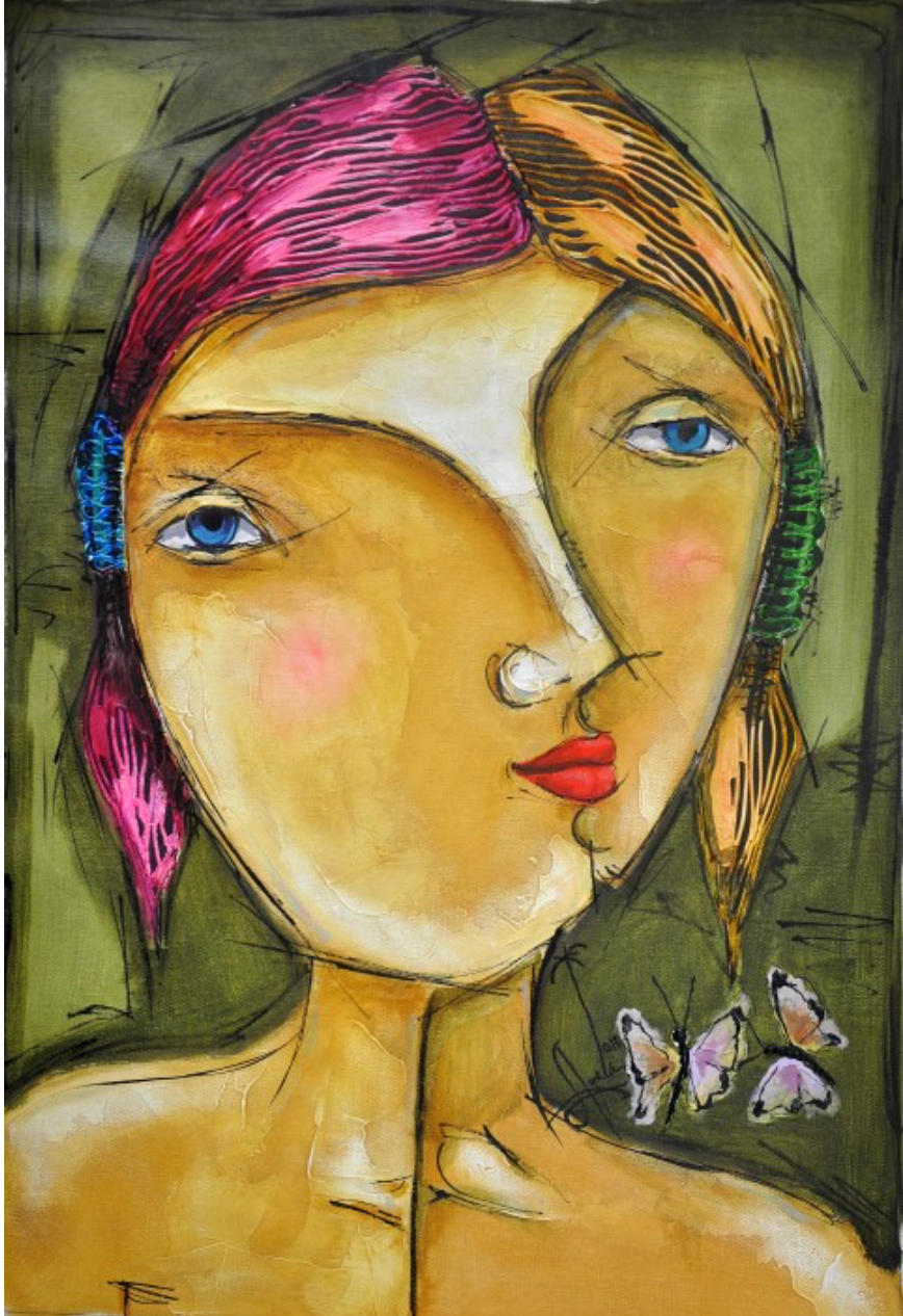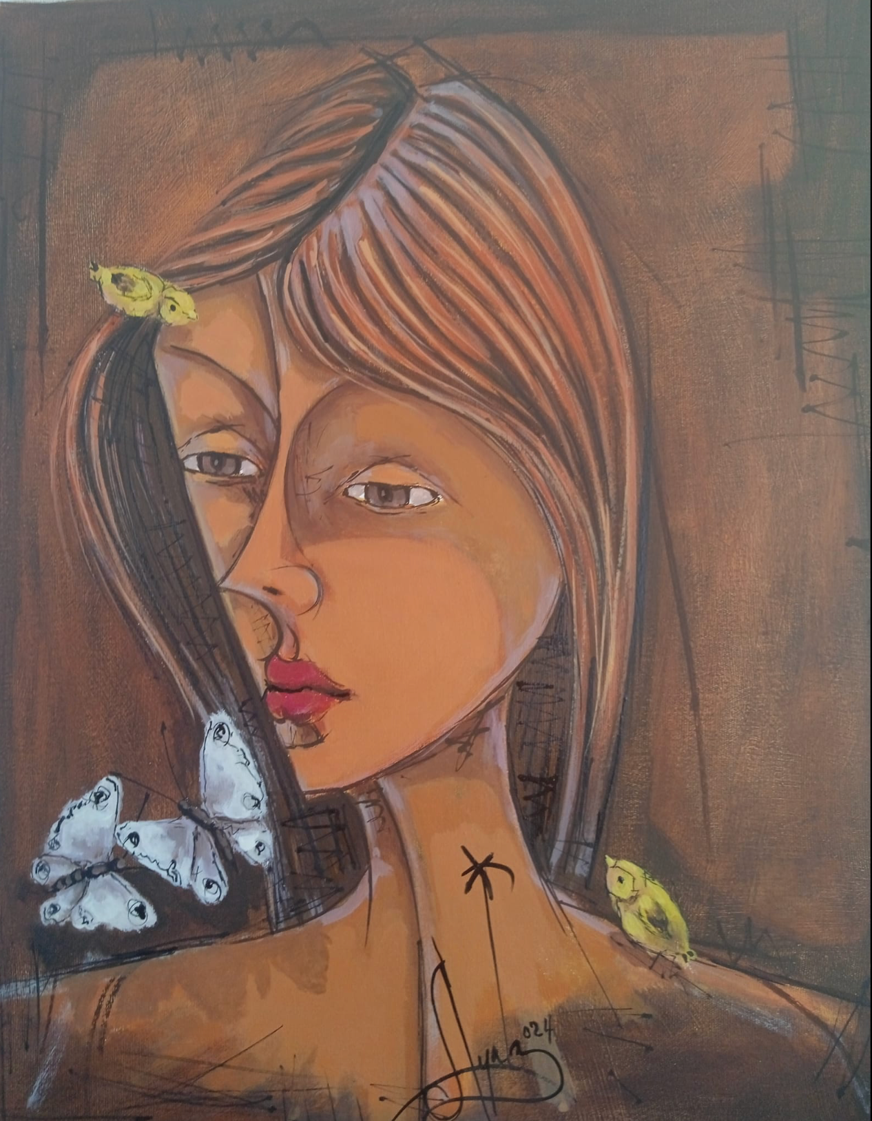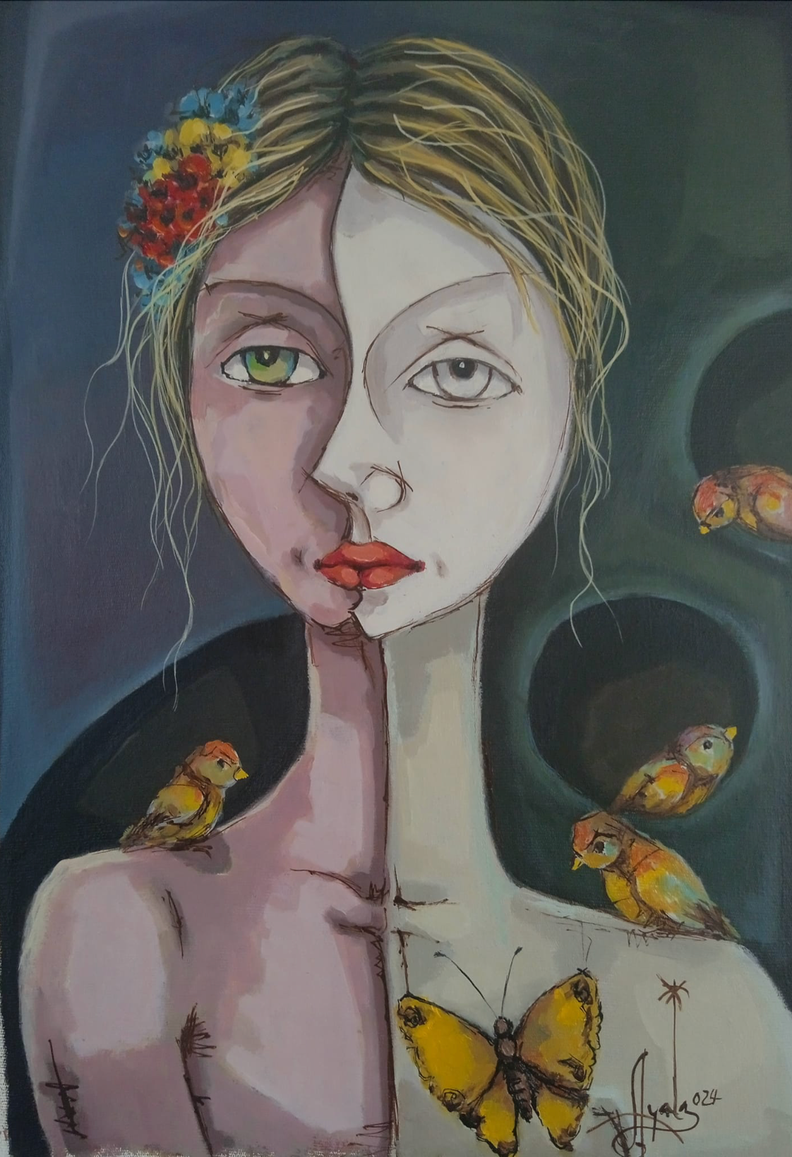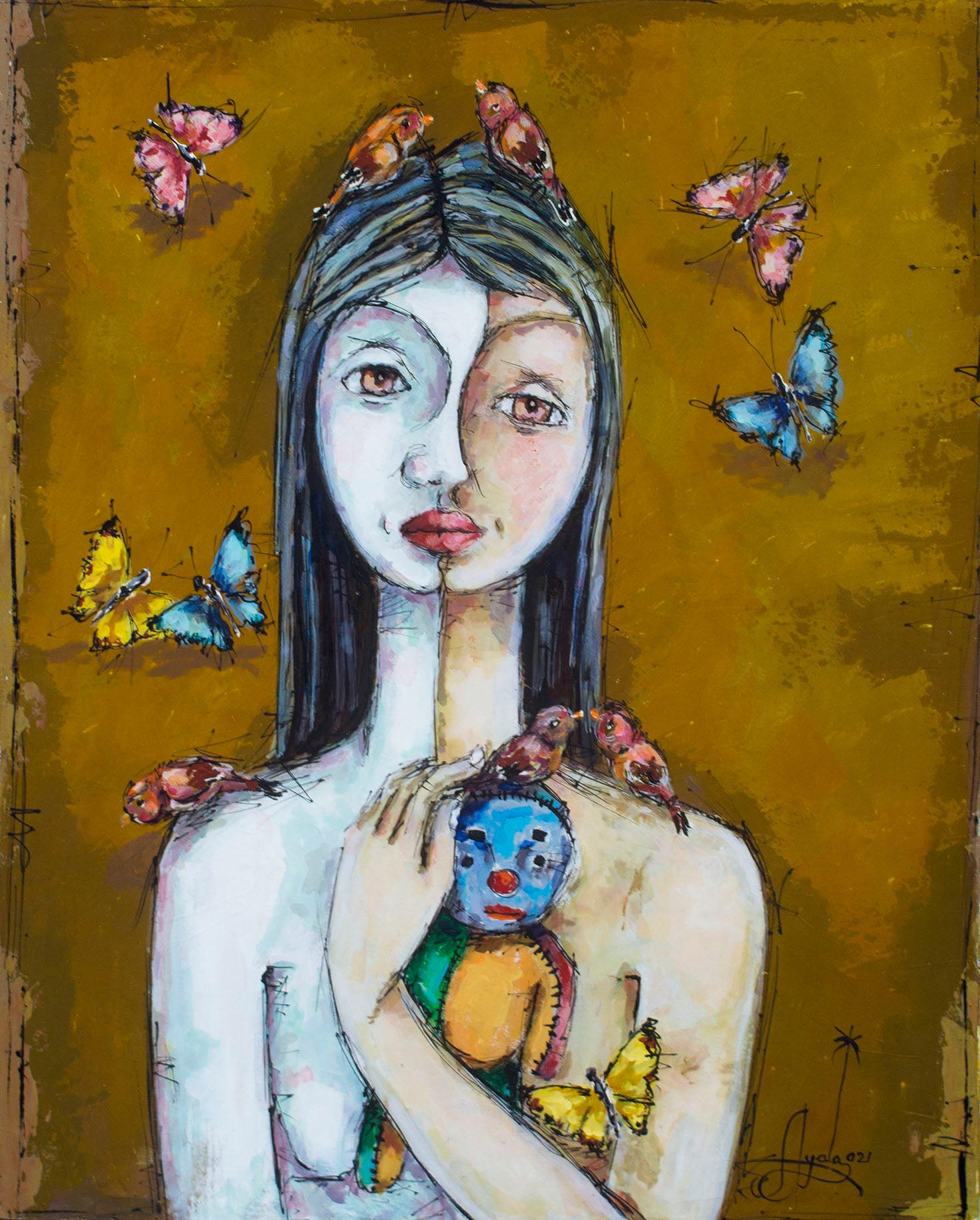 As a gentle witness, "La observadora" (The Observer) gazes outward while exploring her own inner world. Her dual face shows a multifaceted perception, fusing sight with intuition. Symbolic birds and butterflies rest on her, messengers of spirit and soul gathered through her patient, watchful presence.