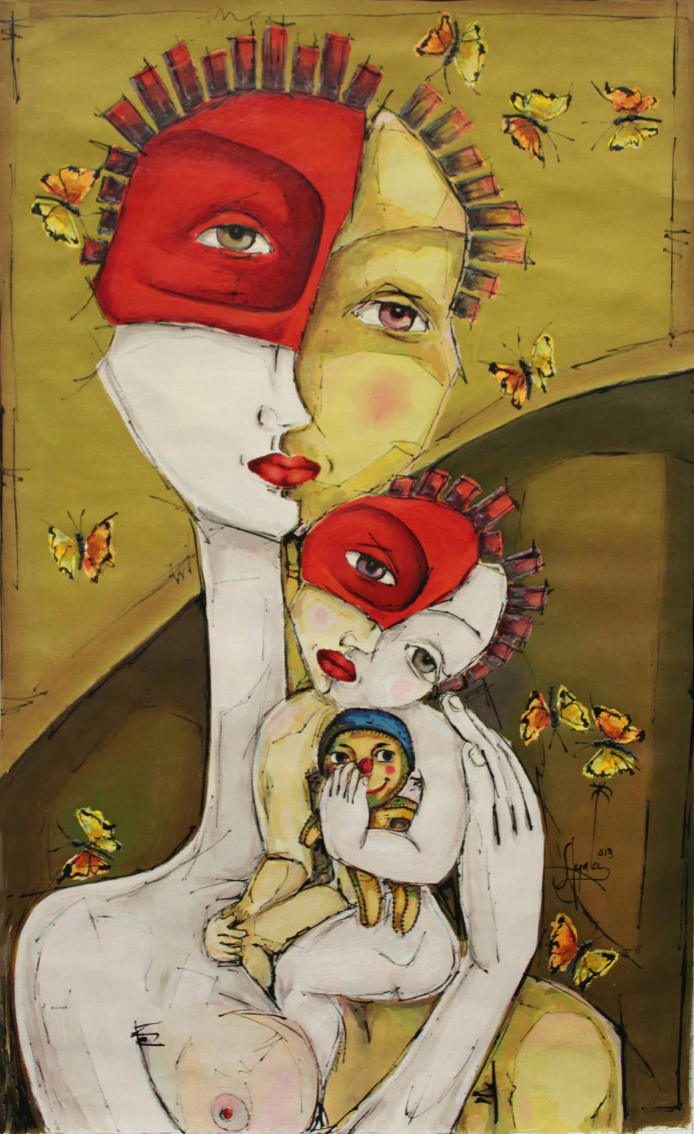 "El deber materno" (The Maternal Duty) portrays motherhood as a profound duty. The mother dons a fierce, red mask—a symbol of the protective, warrior-like persona she must adopt. While her former identity may be cast aside, her embrace remains tender, revealing the duality of her role as both a fierce guardian and a gentle nurturer.