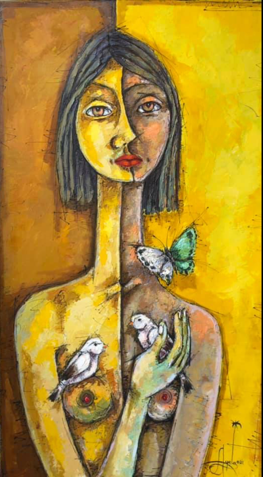 In "Mensaje," (Message) the figure is both messenger and message. She gently offers a bird from her heart—a vulnerable communication of her innermost soul. Arising from her dual nature, symbolized by the split in her body, the message is one of truth, spirit, and transformation, delivered directly to the viewer.