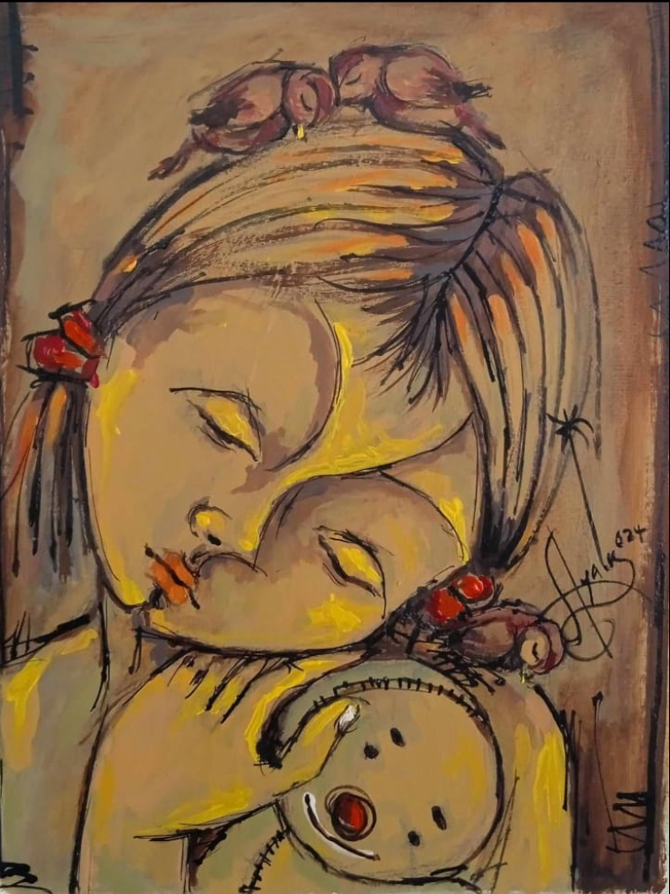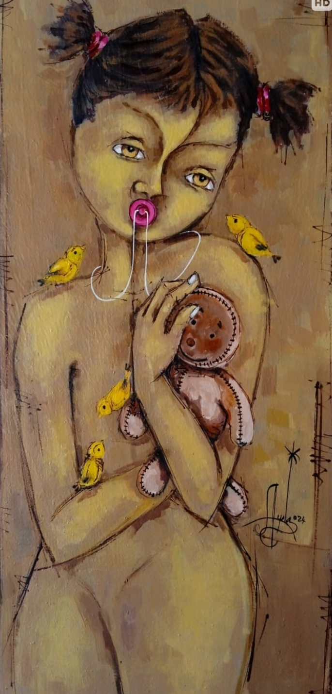 "La Inocente" (The Innocent) explores the fragile nature of innocence. The child figure is a fusion of a real human and an idealized doll, embodying the complexity of this state. In a surreal room where one toy is cherished and another lies broken, the painting reveals that innocence coexists with vulnerability and loss.