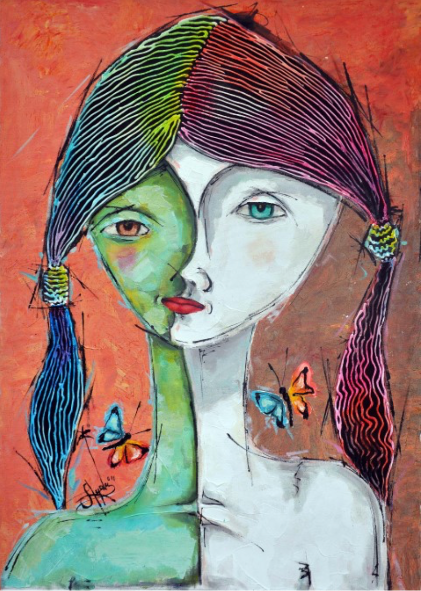 "El Despertar" (The Awakening). It celebrates self-awareness. The figure’s split face is not a conflict, but a peaceful duality. Her vibrantly colored hair symbolizes a mind awakened to its own rich complexity, while her confident gaze shows an acceptance of her multifaceted identity.