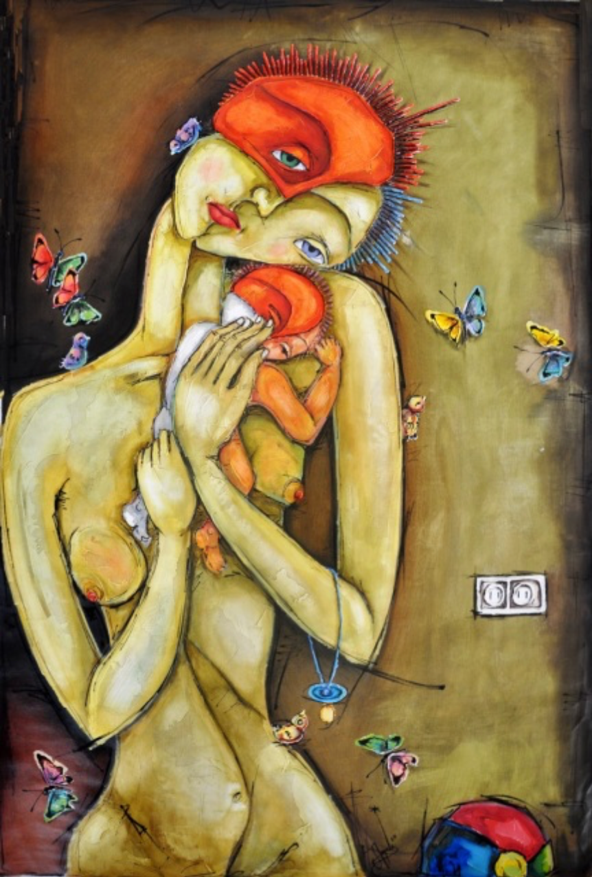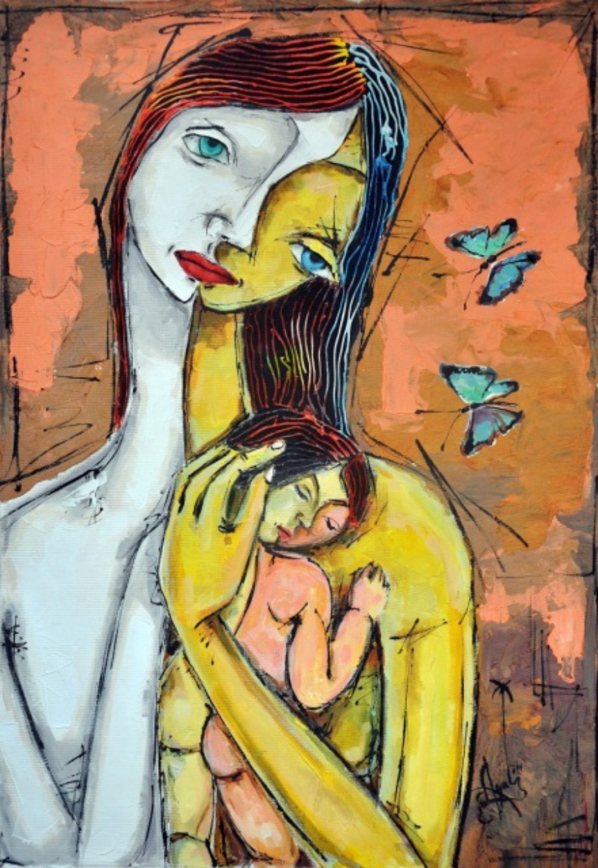 "La Maternidad"(Maternity) portrays motherhood as a profound duality. A serene, archetypal mother (the white figure) fuses with the emotional, human woman (the yellow figure). Together, they represent the complete state of maternity—both a timeless, universal role and a deeply personal, vulnerable experience.
