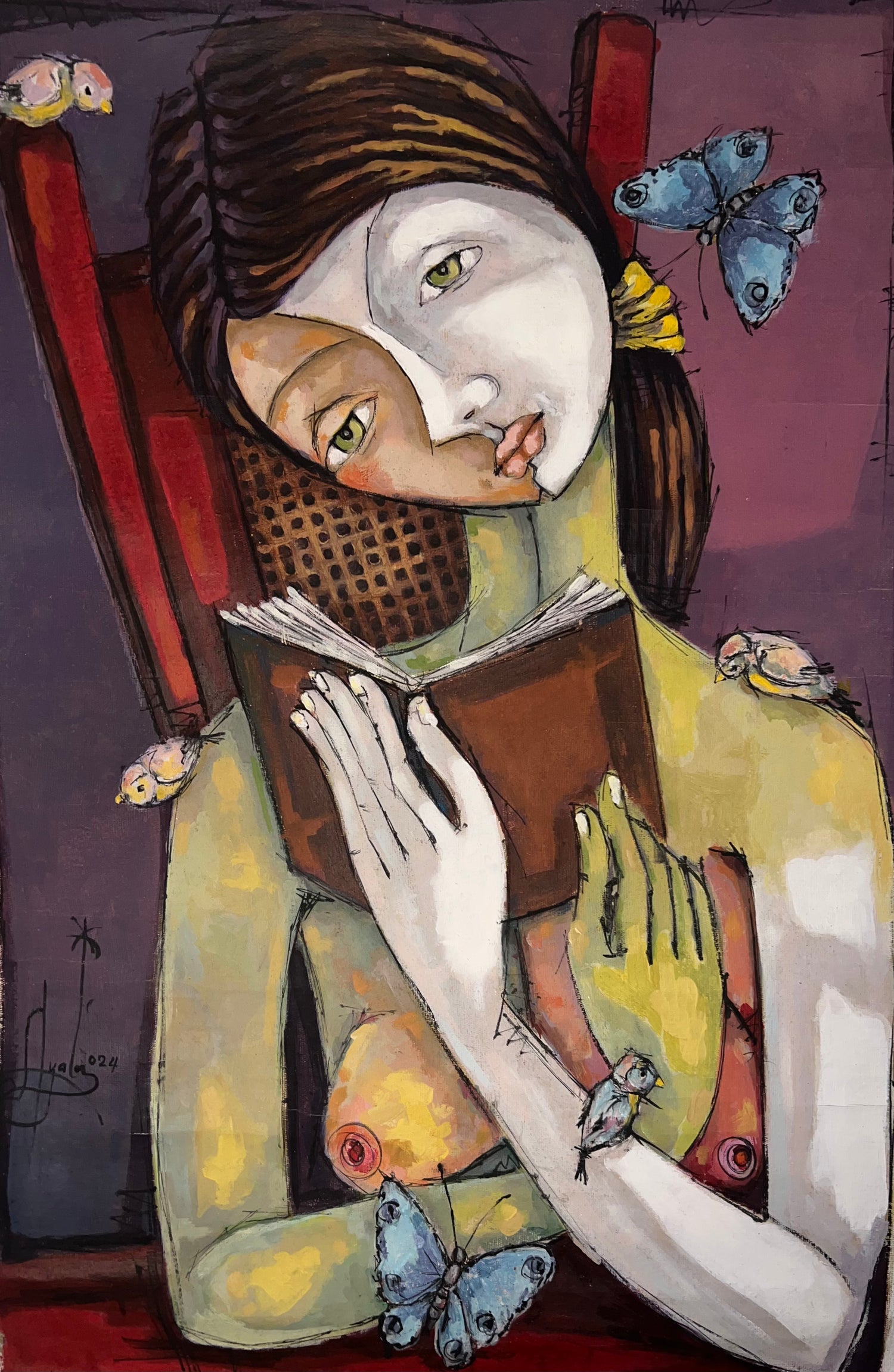 "La lectora" (The reader) portrays reading as a transformative journey. The reader's split face suggests her simultaneous existence in the real world and the story's realm. As she reads, ideas and characters escape the page as living birds and butterflies, populating her world and blurring the lines of reality.