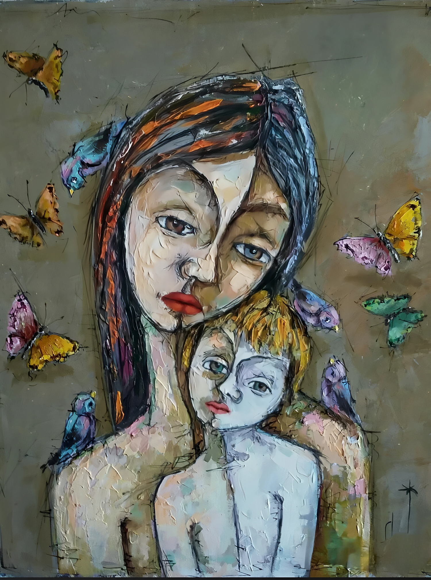 In "El Refugio," (The Refuge) a mother's loving embrace creates the ultimate shelter. Her body shields the child in a sacred space of safety and peace. Surrounded by symbolic butterflies, their inseparable bond forms a tranquil refuge from the outside world, an emotional fortress built of pure love and protection.