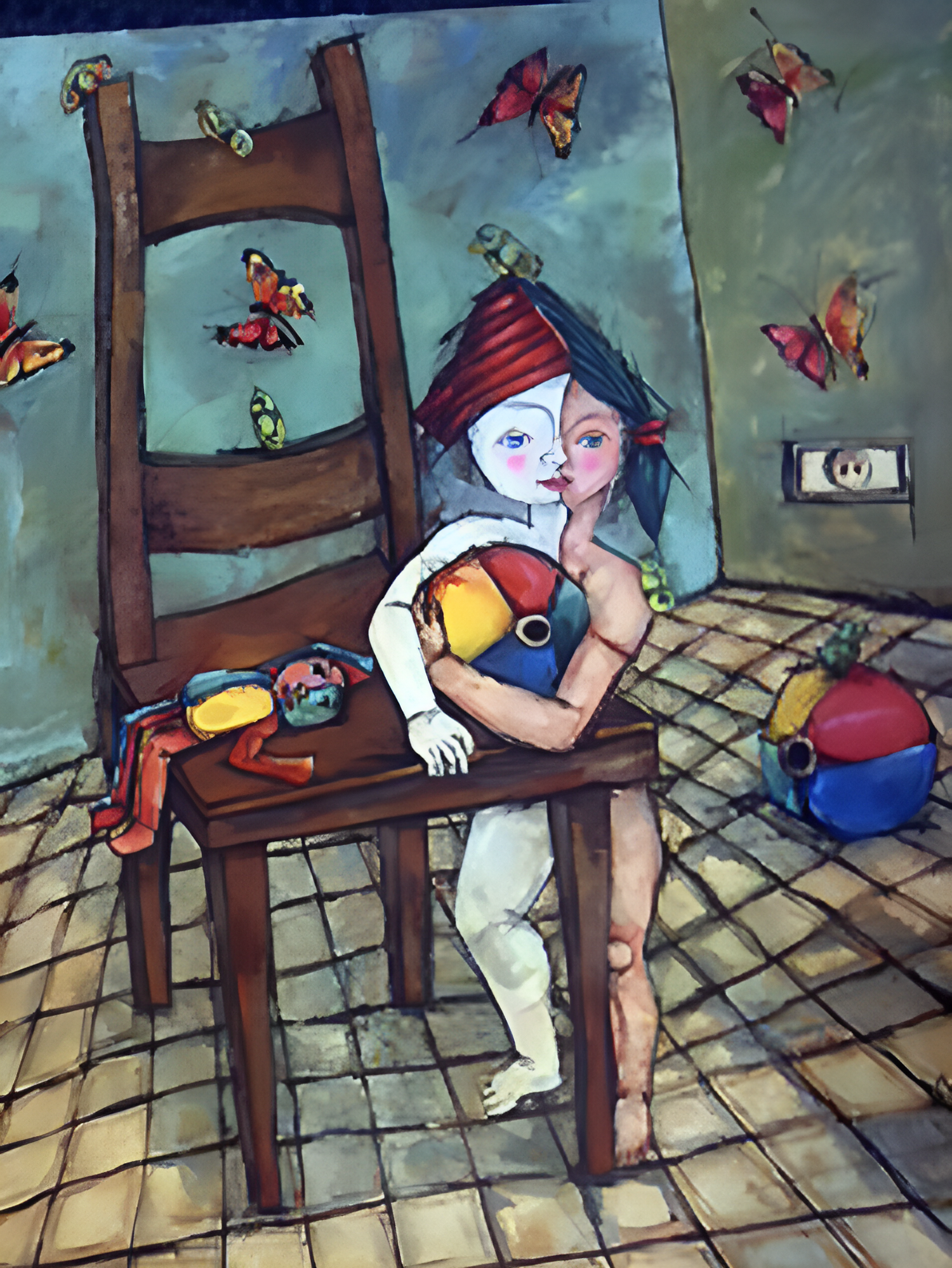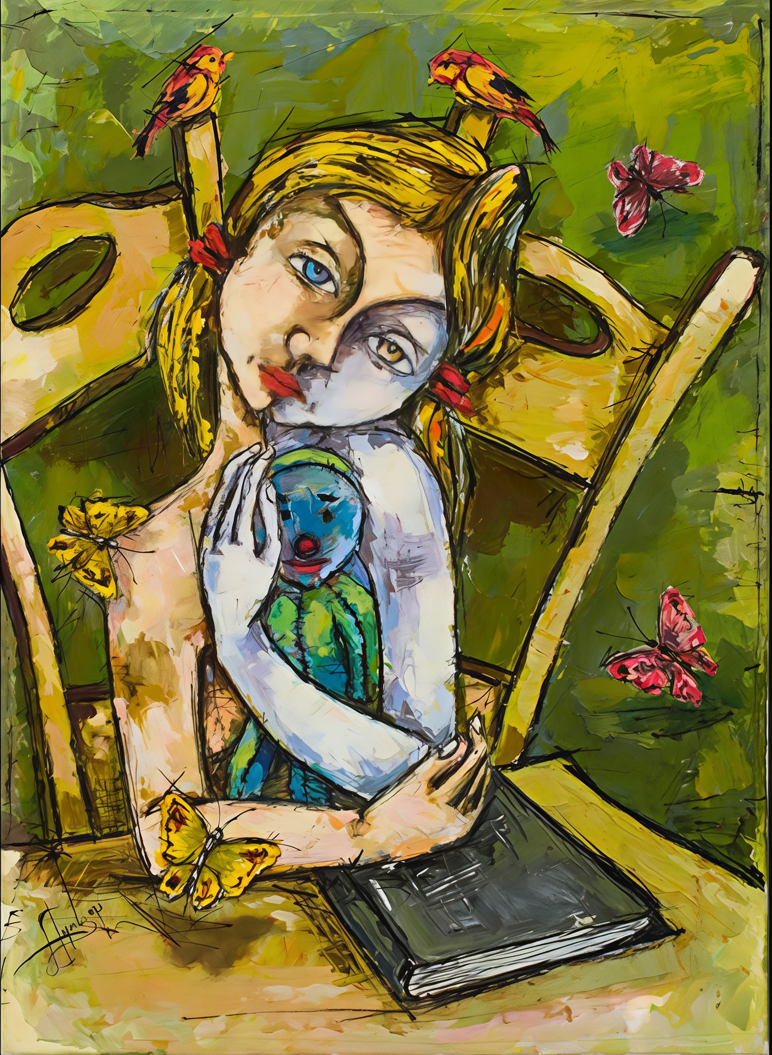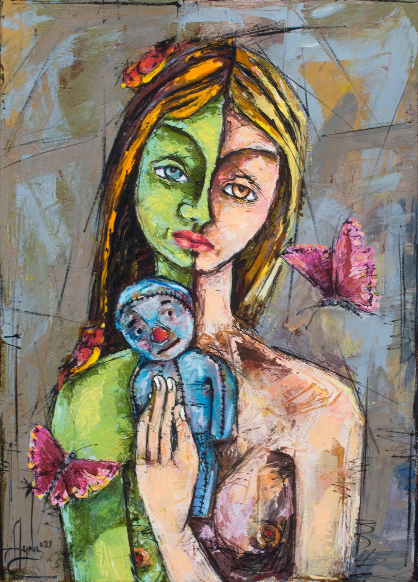 "Poesia"(Poetry) is a stunning visualization of poetry itself. The central figure is the poem, her split face reflecting life's essential dualities. She holds a doll—a core inspiration—close to her heart, while birds and butterflies flutter around her like beautiful words and ideas taking flight.