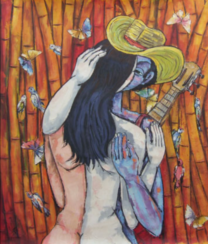 "Serenata" (Serenade) In a secluded Cuban Sugar cane grove, a mystical, blue musician embraces their lover. The guitar is the language of their passion, fusing them into a single being. Around them, birds and butterflies represent the notes of the song—and their souls—taking flight.