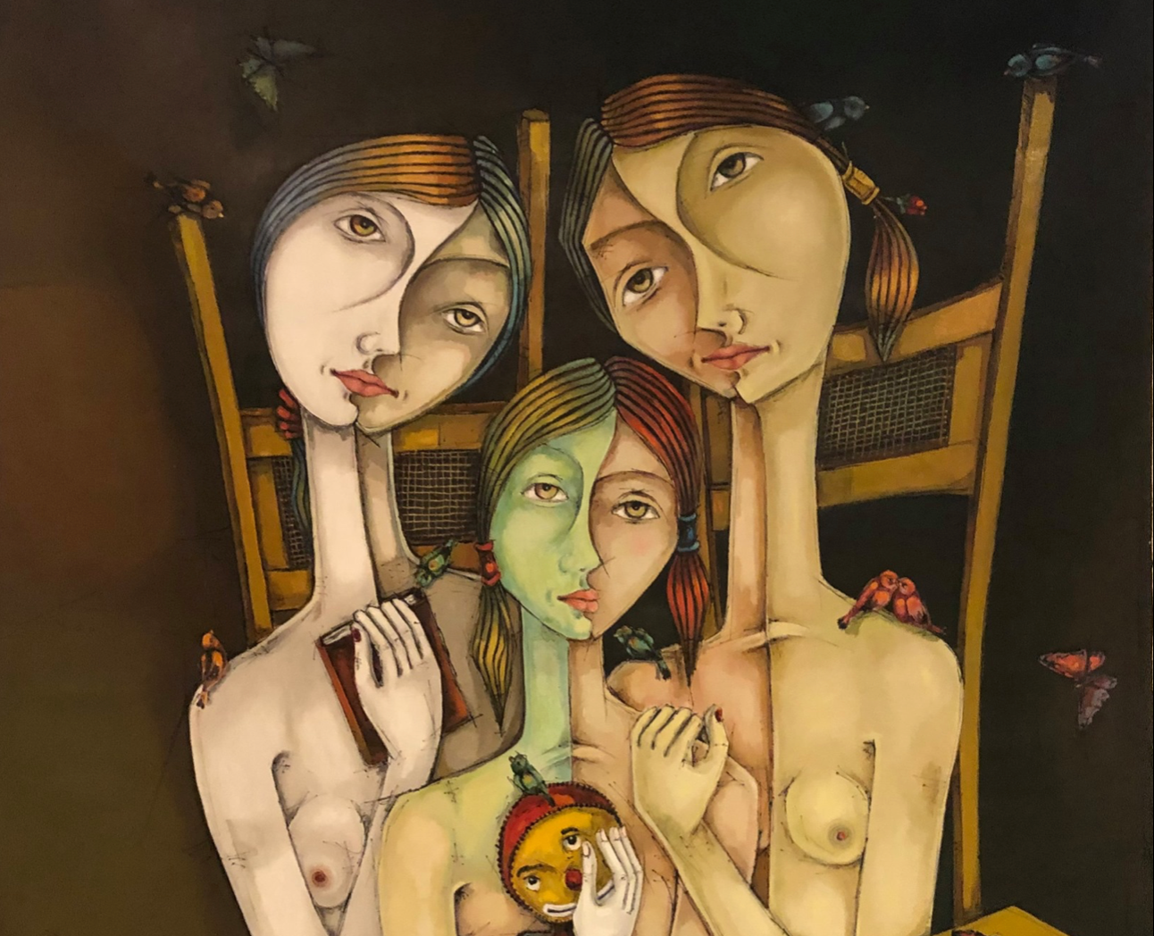 "La familia" (The Family), is a complex portrait of lineage. Three women unite in an embrace of both support and constraint, their solemn gazes hinting at a shared history. The central figure cradles a two-faced doll, a powerful symbol of the hidden dualities and unspoken secrets held deep within the family bond.