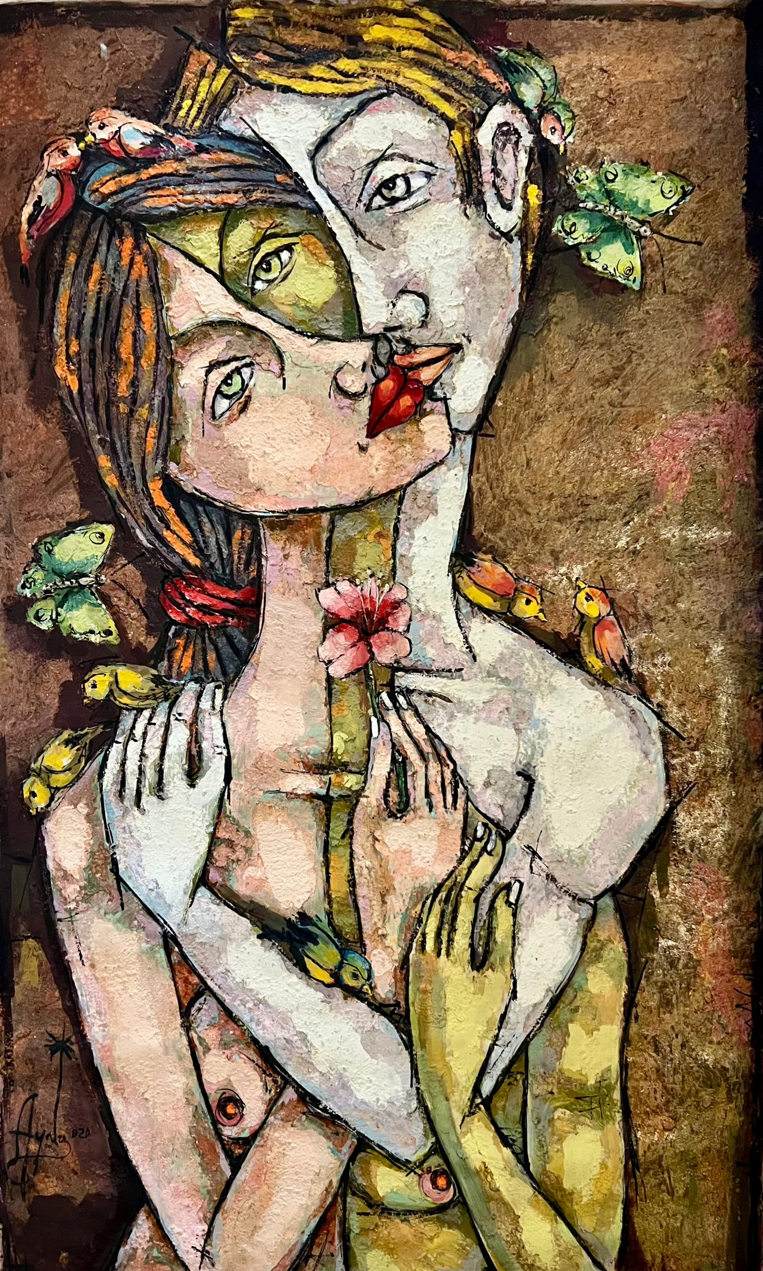 In the "Enamorados" (Lovers) masterfully visualizes the fusion of two souls. Their faces merge into one as they jointly nurture a single flower—a symbol of their shared bond. Surrounded by birds, their intertwined embrace signifies a complete union where two people become an inseparable, single entity