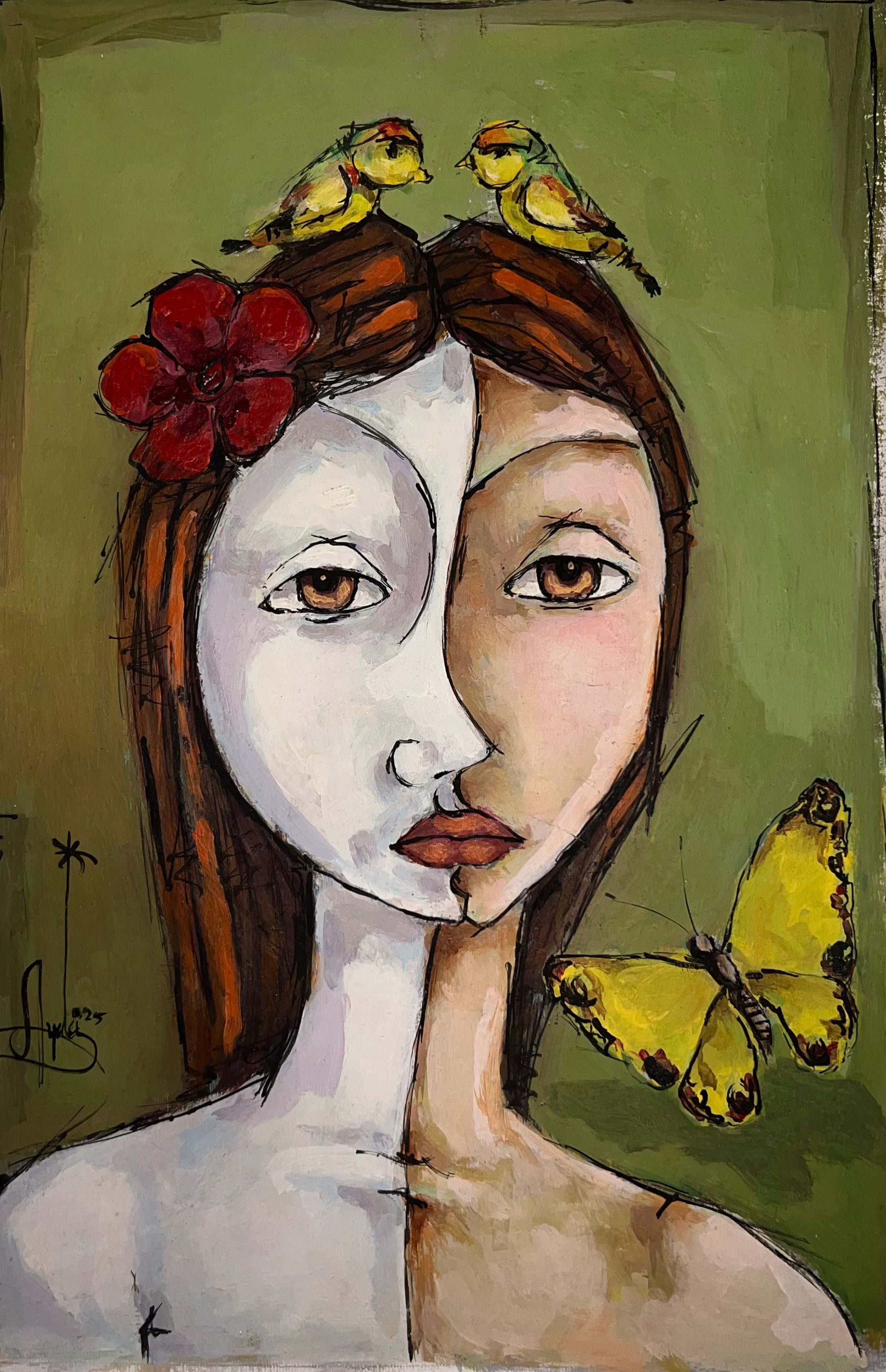 "Duality of Being" is a profound artistic statement, masterfully balancing contrasting elements to create a harmonious whole. This compelling portrait invites introspection, celebrating the complex layers of identity and the beauty found in our multifaceted selves. A truly unique piece that enriches any discerning collection.