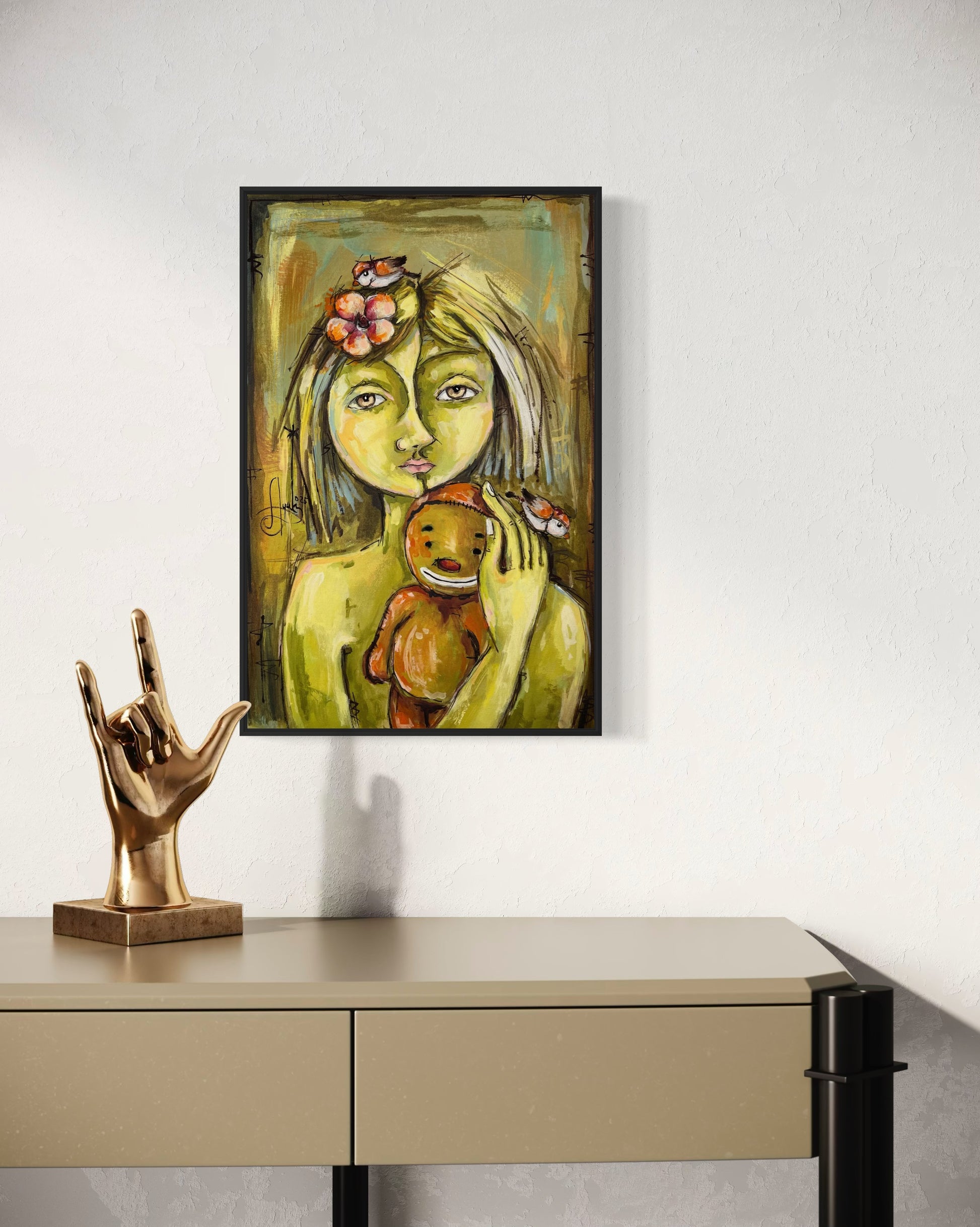 Set against a textured background of earth tones and washed teals, the painting balances the warmth of human emotion with the artist's surrealist edge. The visible brushstrokes and stitched details on the doll add a tactile, folk-art quality to this sophisticated piece.