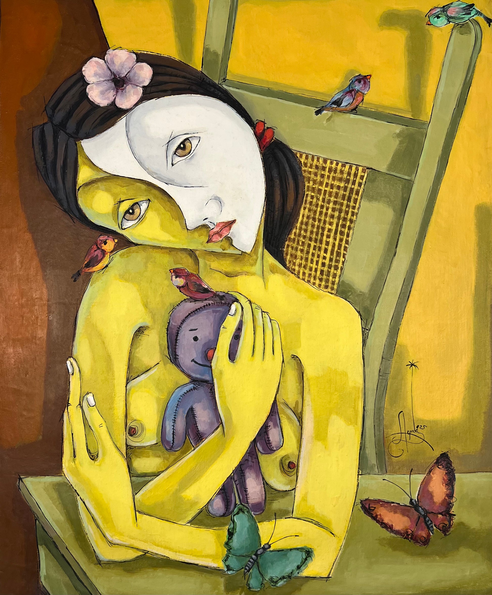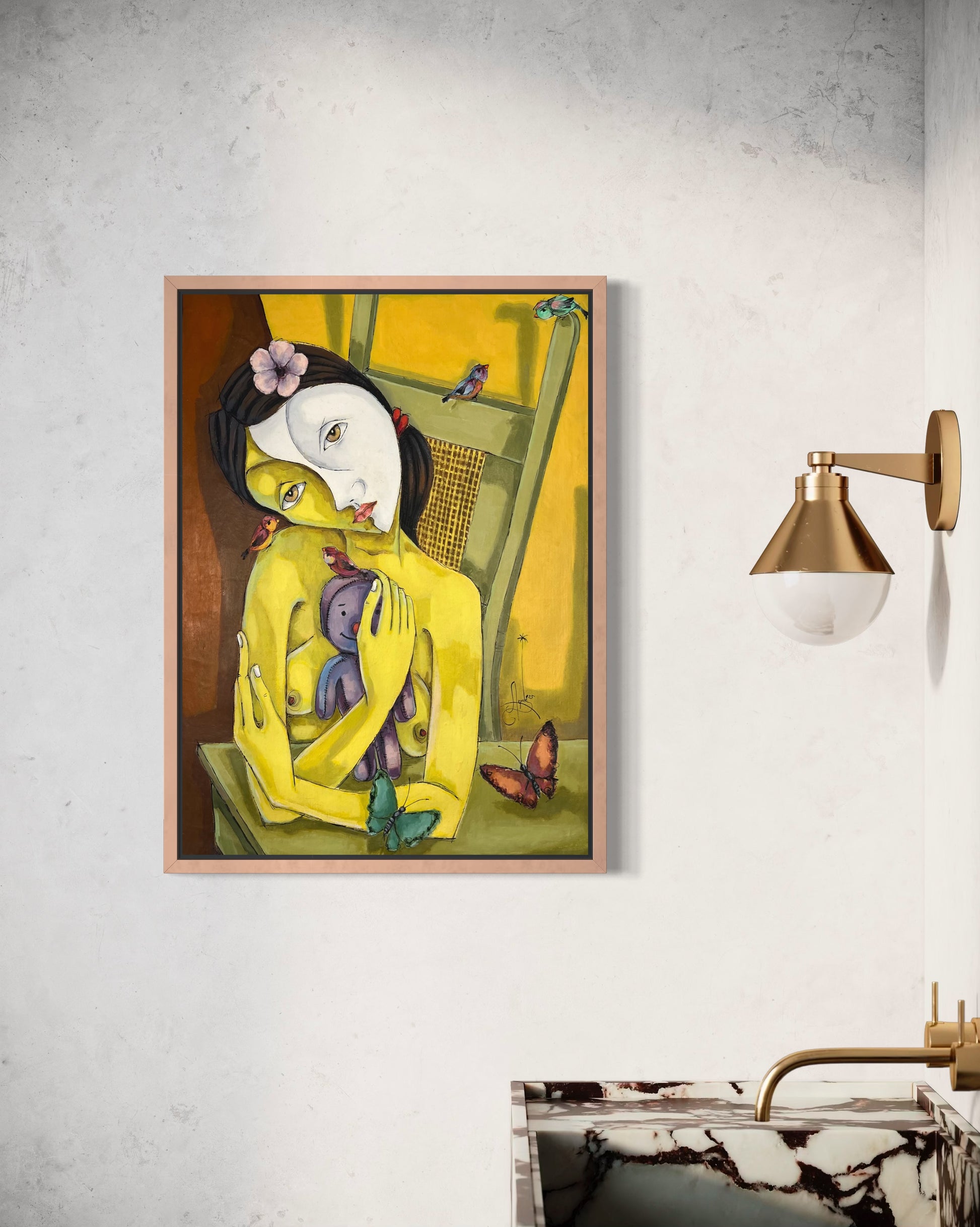 "Santuario de Luz" is exceptional for its use of color. The bold choice of a purple doll against the yellow and green backdrop demonstrates Ayala’s mastery of color theory, making this piece vibrant, modern, and deeply inviting.