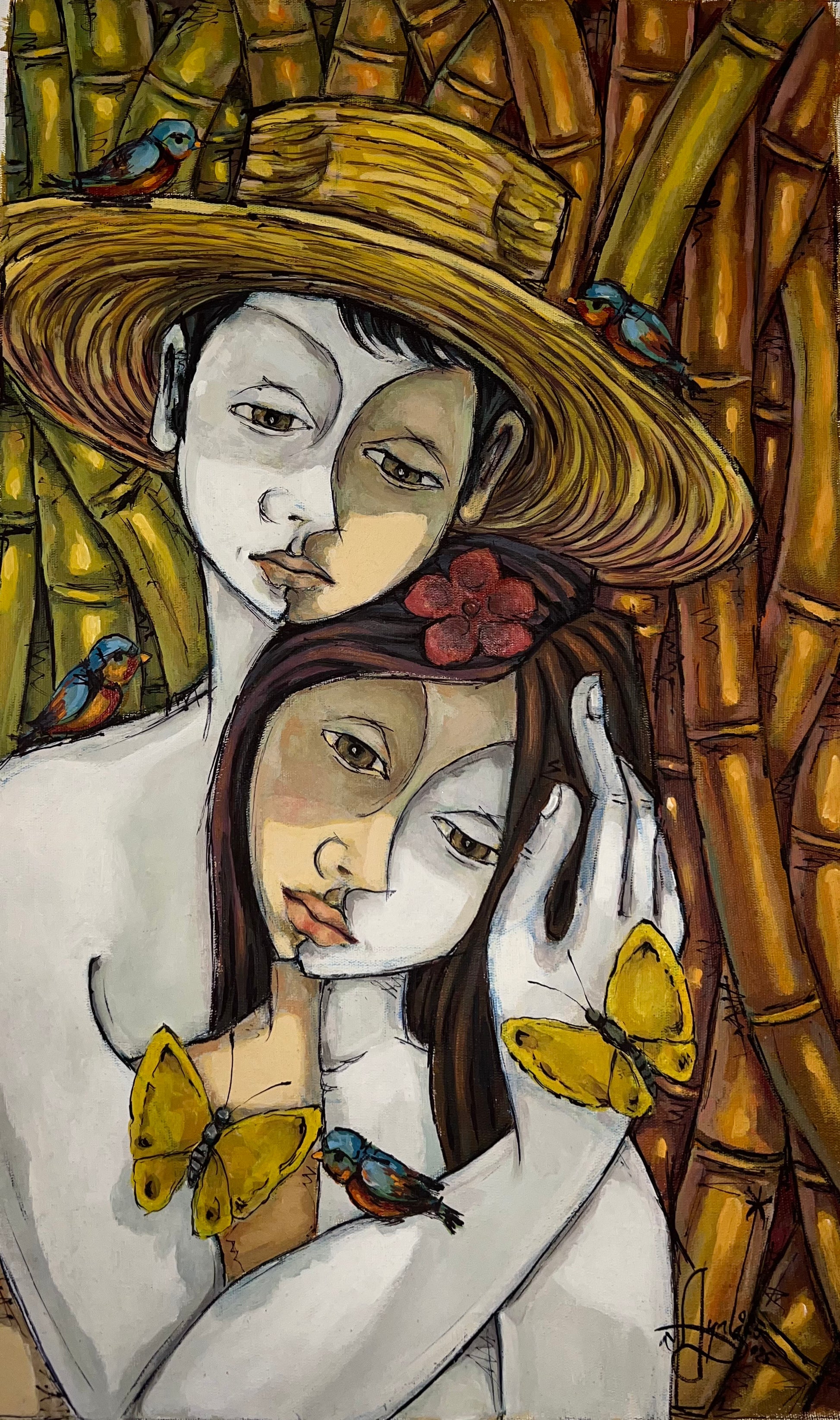 "Shared Horizon" beautifully illustrates the profound comfort and strength found in companionship. Embraced amidst golden bamboo and fluttering butterflies, this piece celebrates love's journey and the enduring bond between two souls. A truly heartfelt artwork that inspires a sense of unity and hope.