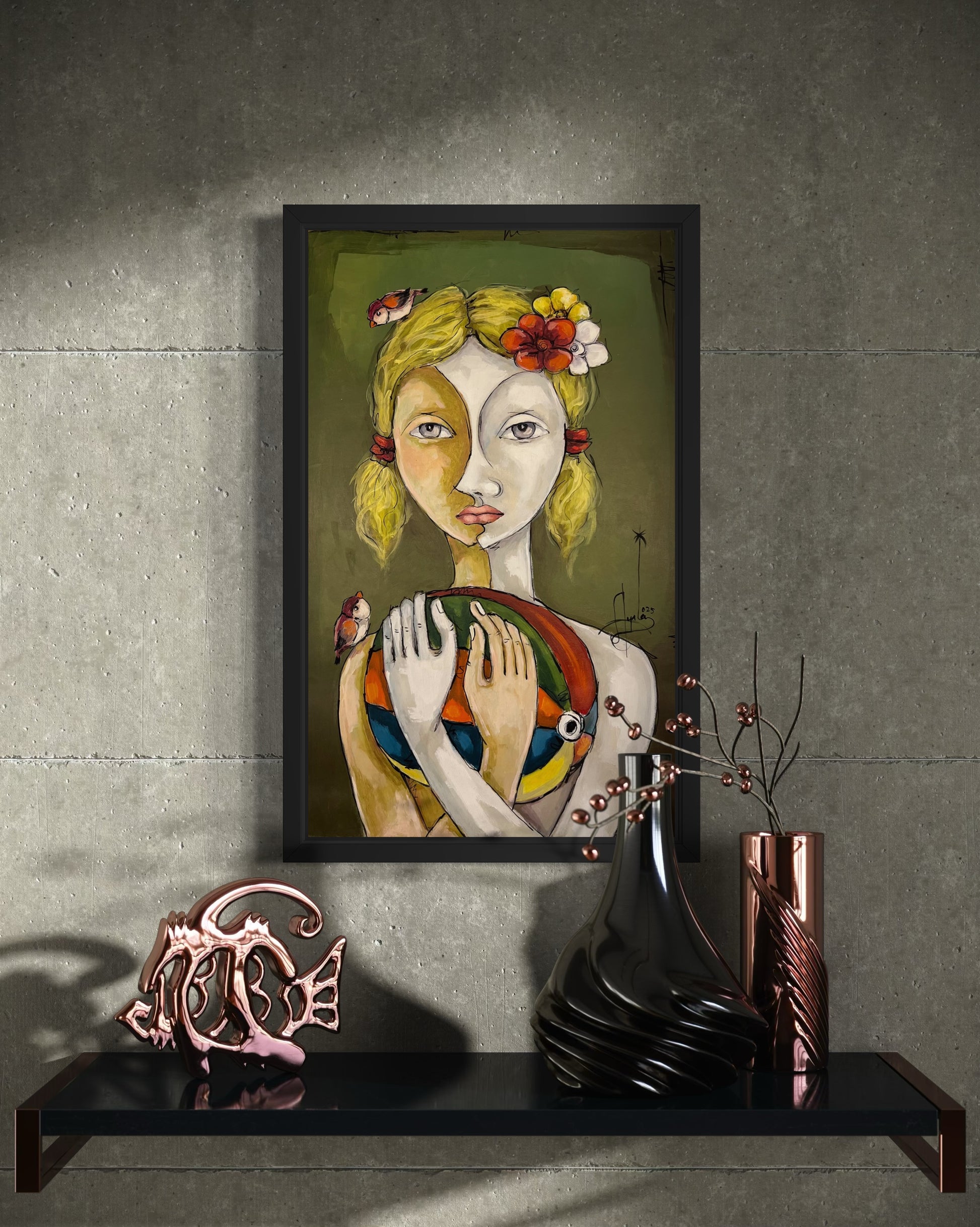 She cradles a vibrant, multi-colored sphere close to her chest, perhaps representing the world of her dreams or the colorful complexity of her inner thoughts. Adorned with tropical flora and accompanied by small birds, the composition bridges the gap between human emotion and the natural world, a recurring theme in Ayala’s celebrated portfolio.