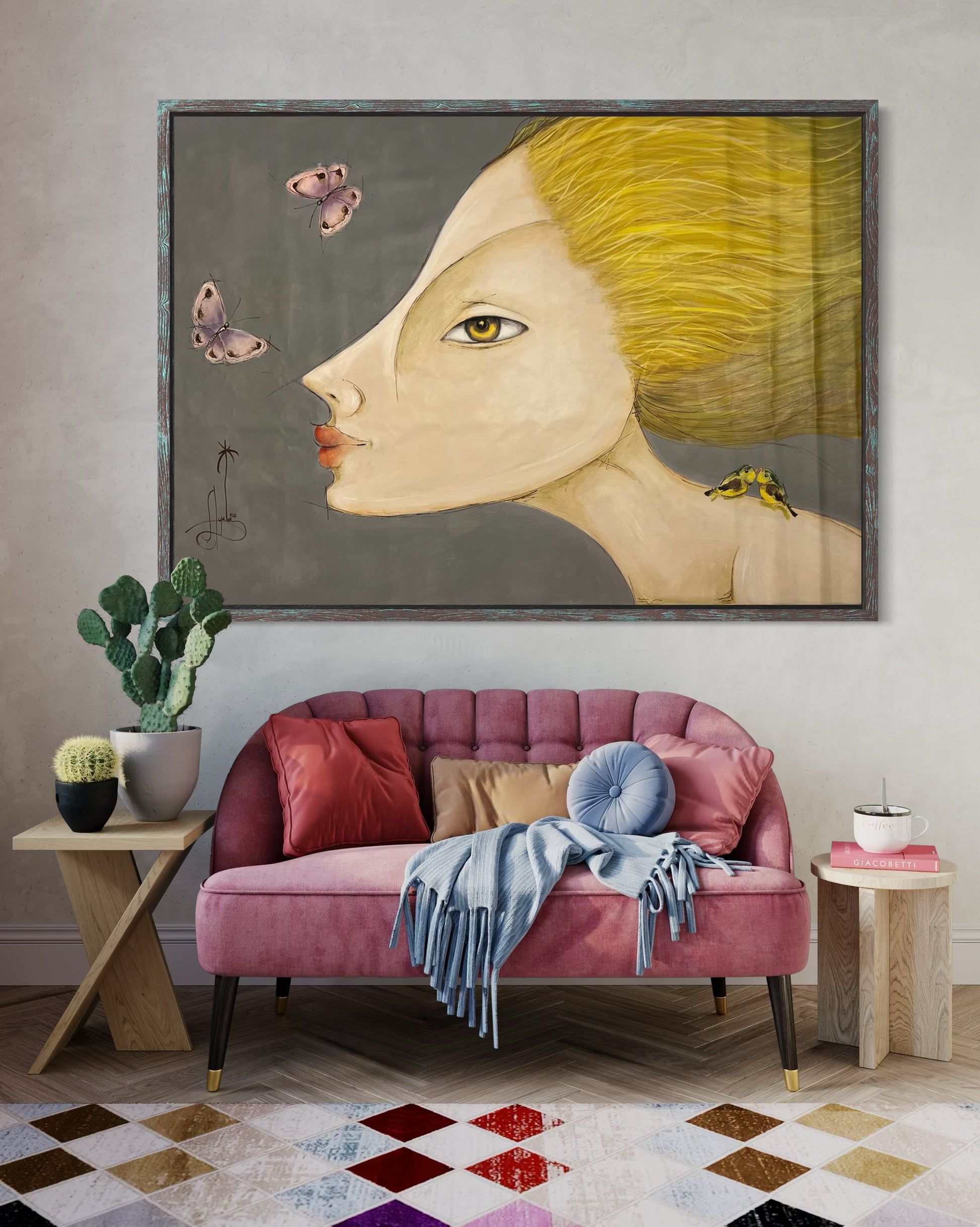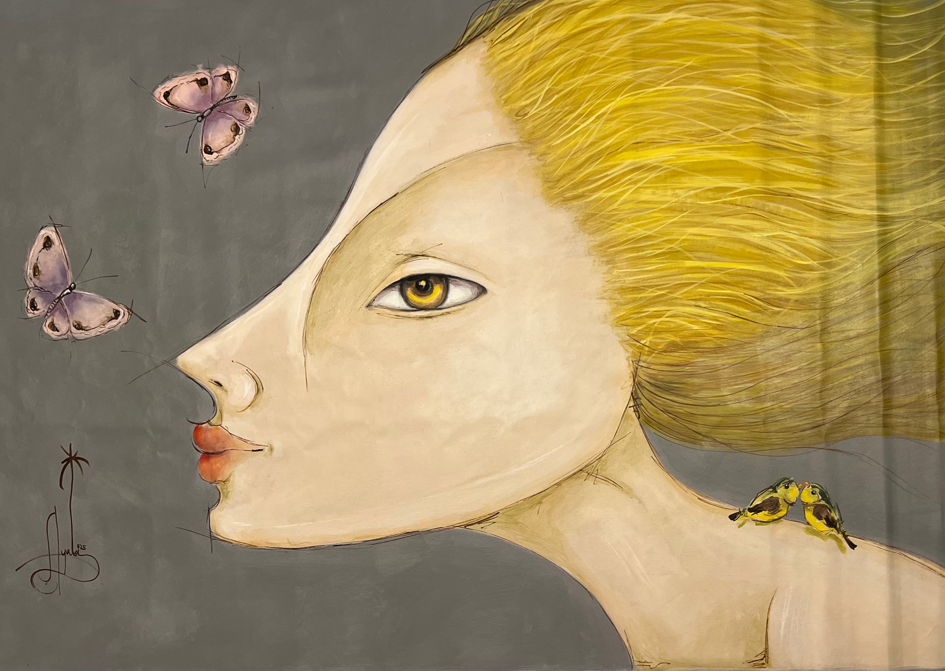 Set against a cool, slate-grey background that evokes an overcast sky or the calm before a storm, the warmth of the subject's face and hair pops beautifully. Two delicate, pale violet butterflies flutter against the wind, while a pair of small yellow birds find sanctuary on the curve of her neck, symbolizing stability amidst change.
